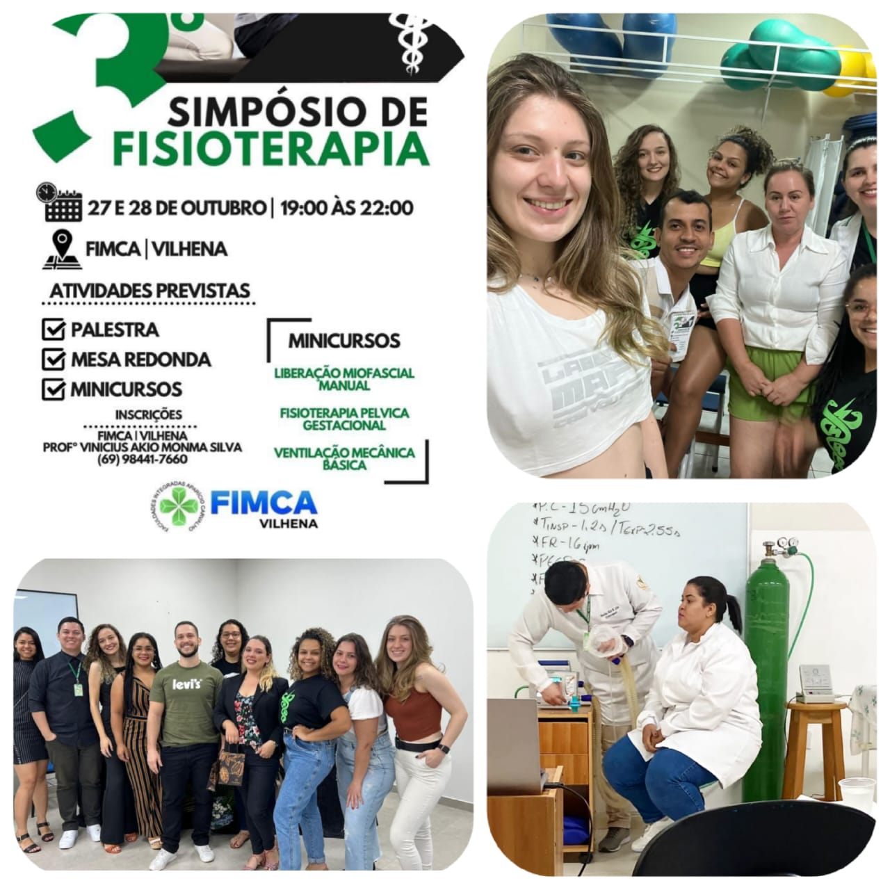 A FIMCA Vilhena realizou, nos últimos dias 27 e 28 de outubro, o 3° Simpósio de Fisioterapia. O evento foi organizado pela instituição, juntamente com a coordenação do núcleo da Saúde e o professor de Fisioterapia, Akio Monma Silva, e aconteceu na própria instituição. Foram ofertados aos acadêmicos palestras, mesa redonda e minicursos de Ventilação Mecânica Básica, Liberação Miofascial Manual e Fisioterapia Pélvica.