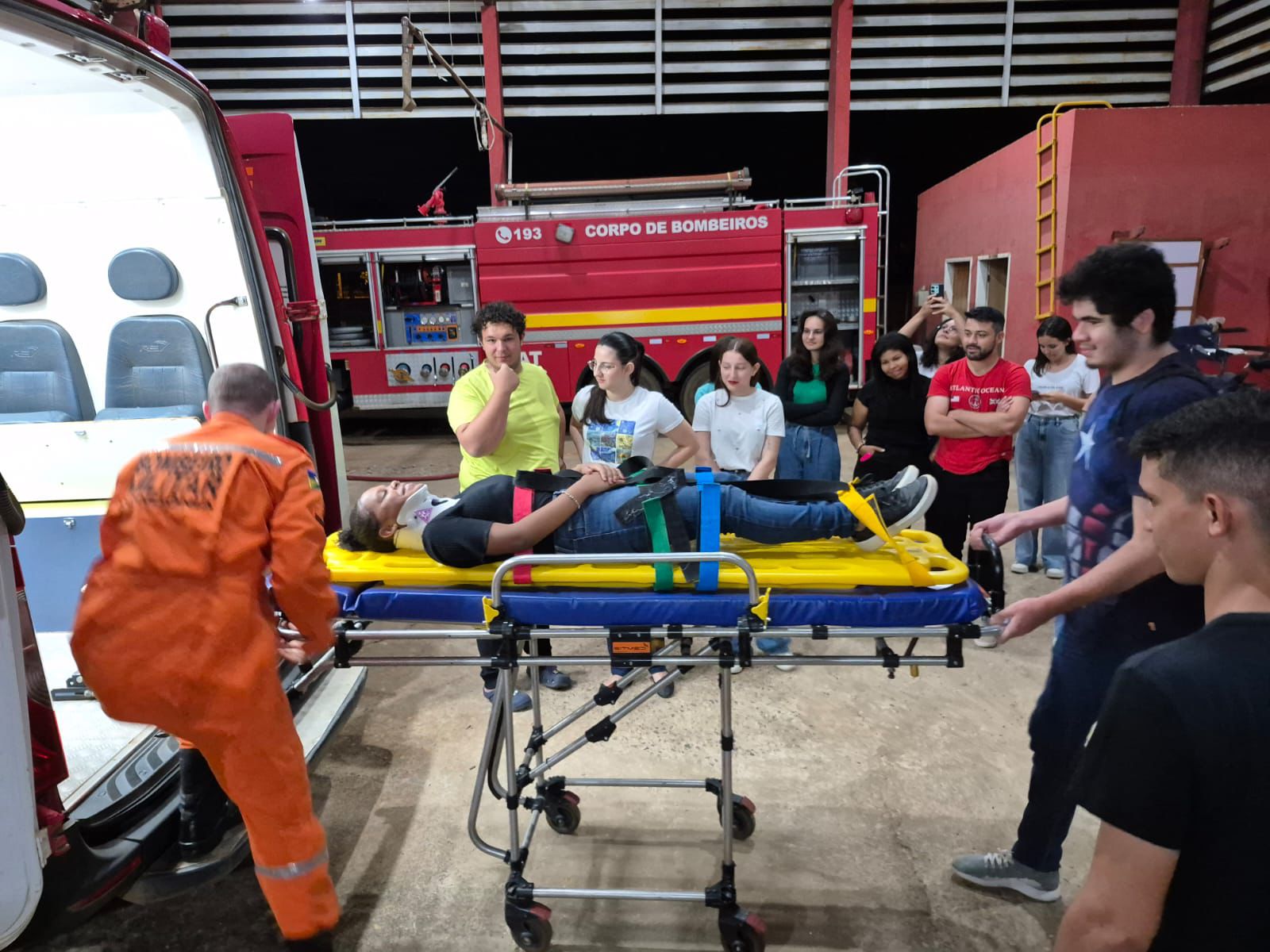 Acompanhados pela professora Aline Aranha, os estudantes tiveram a oportunidade de conhecer a estrutura da corporação, compreender os principais atendimentos realizados pela equipe e aprender na prática sobre os cuidados essenciais nos primeiros socorros.