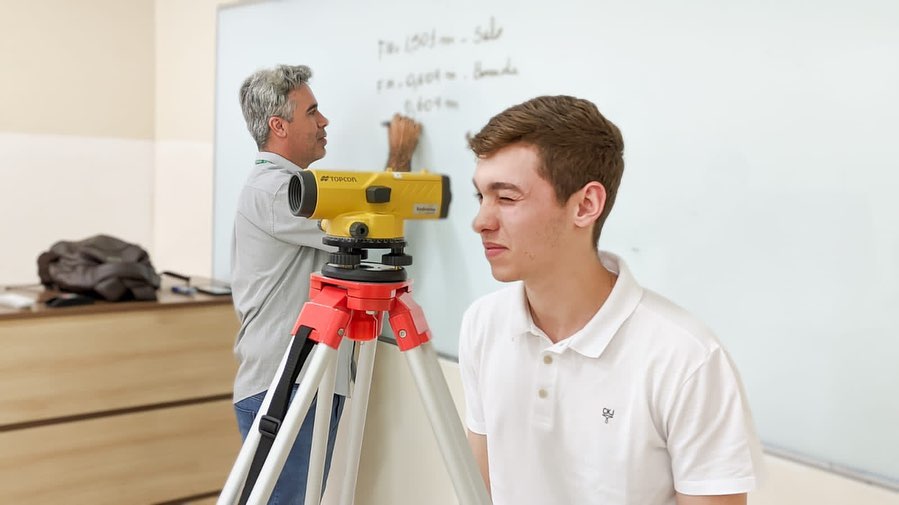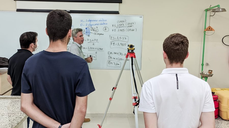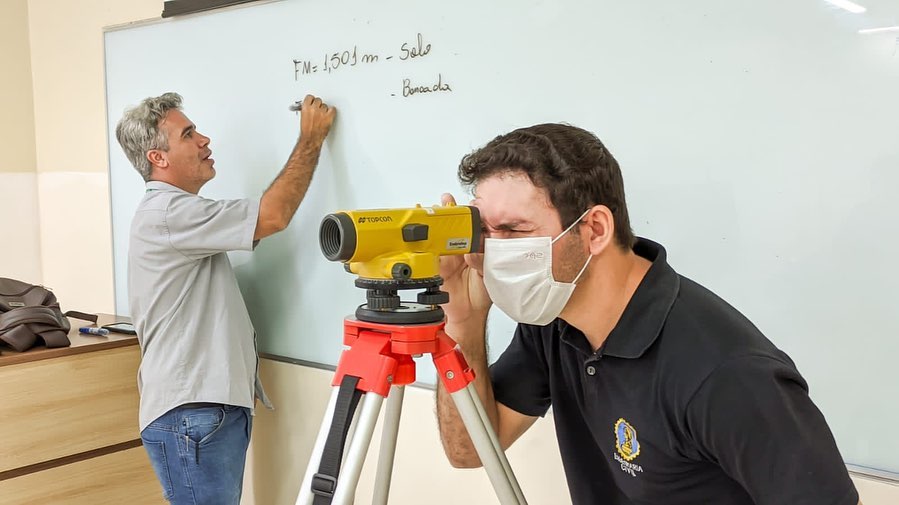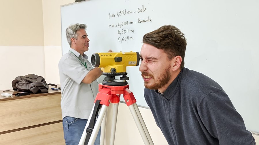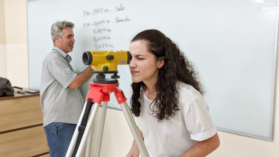 Os acadêmicos do 5º período de Engenharia Civil da FIMCA Vilhena estão tendo contato com o aparelho denominado como NÍVEL que é utilizado na topografia para medição da altura de um determinado ponto no terreno, eles estão aprendendo a usar o nível com a mira (uma espécie de régua topográfica) para fazer a leitura da altura do ponto.