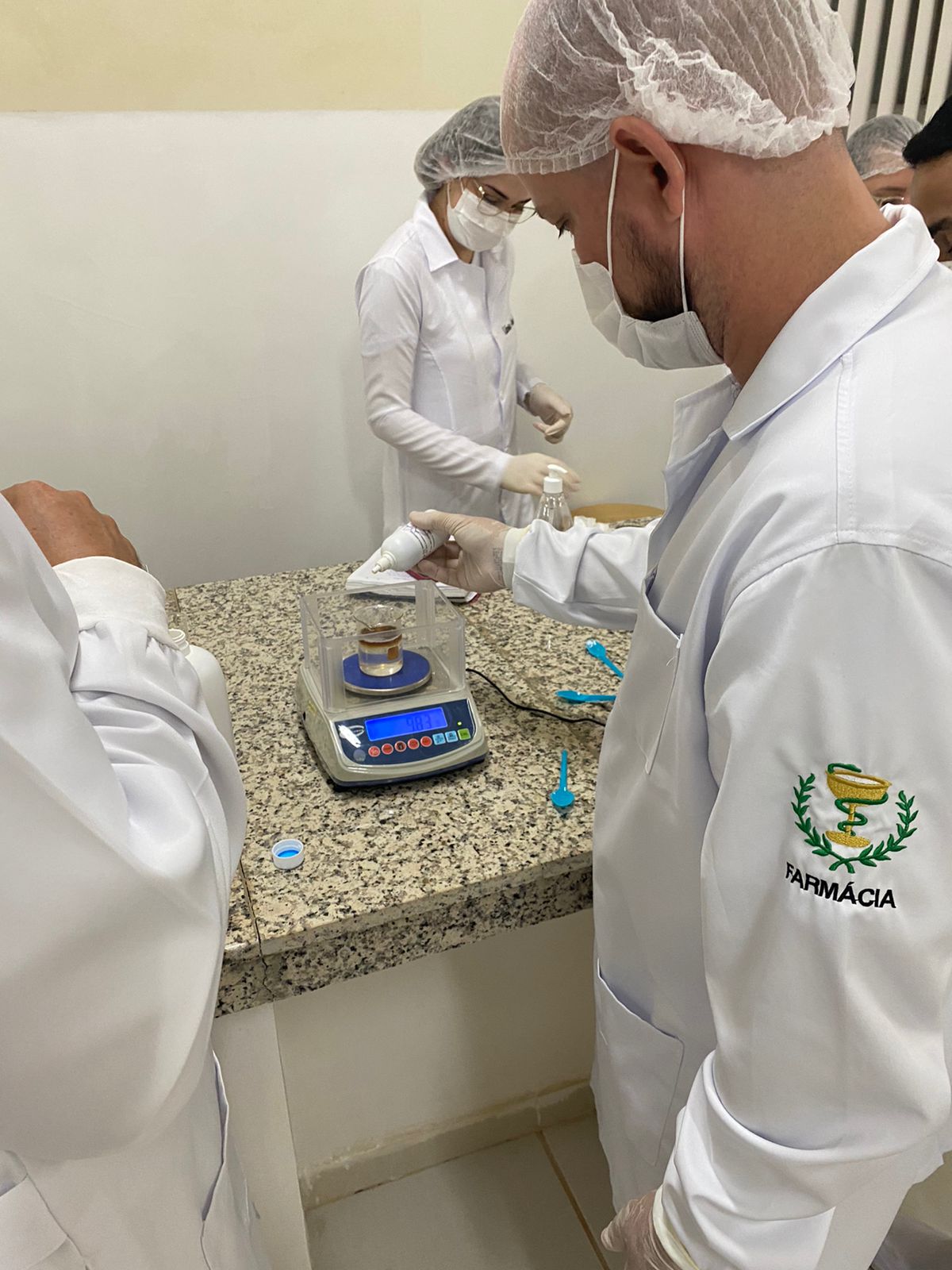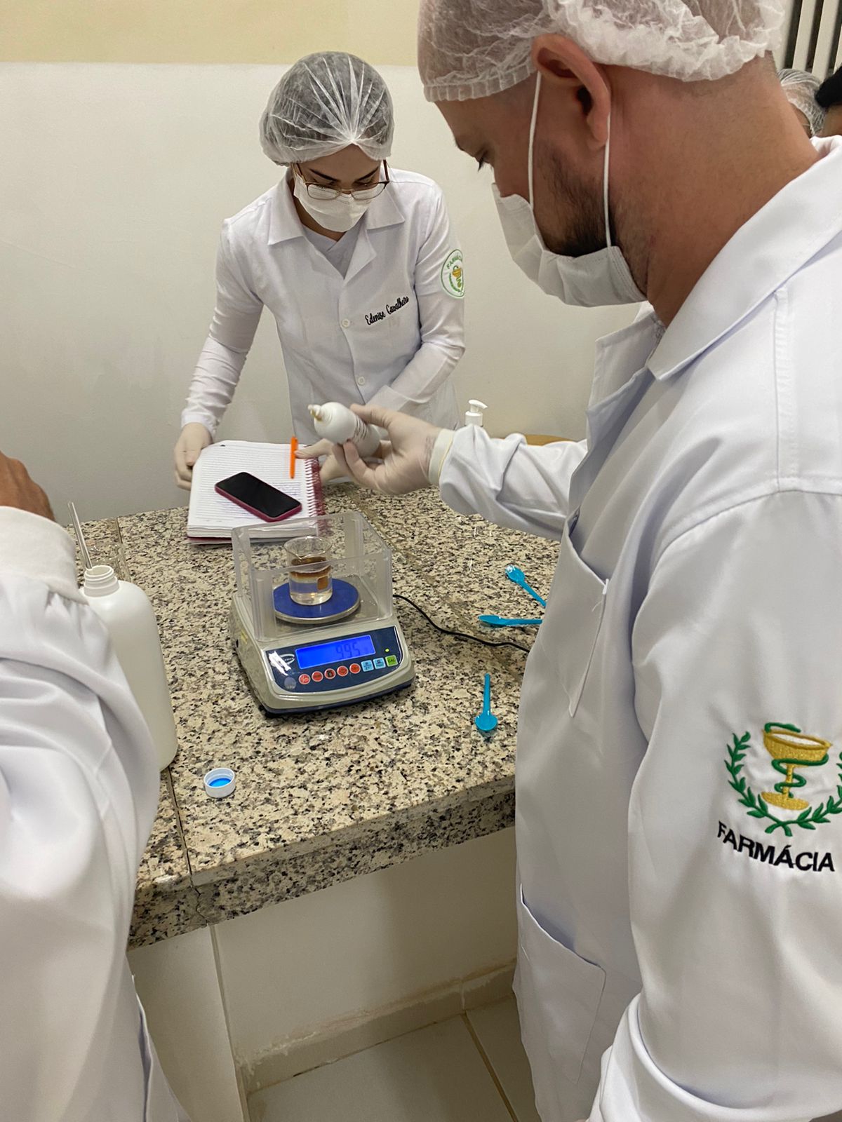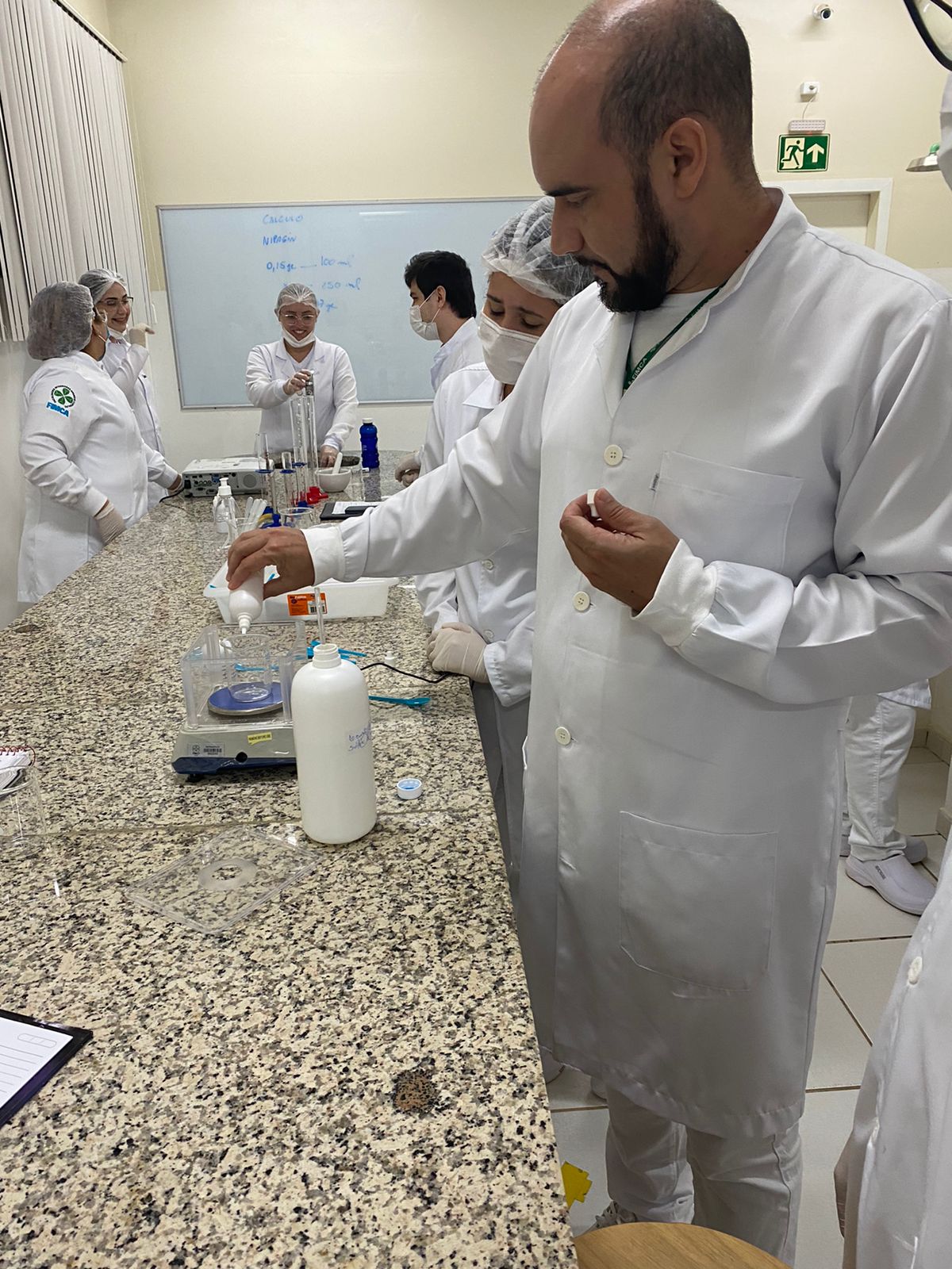 Os acadêmicos do 5 período de Farmácia participaram ontem (25), da produção de shampoo com o Professor Felipe Vitalli, na aula prática de Farmacotécnica.