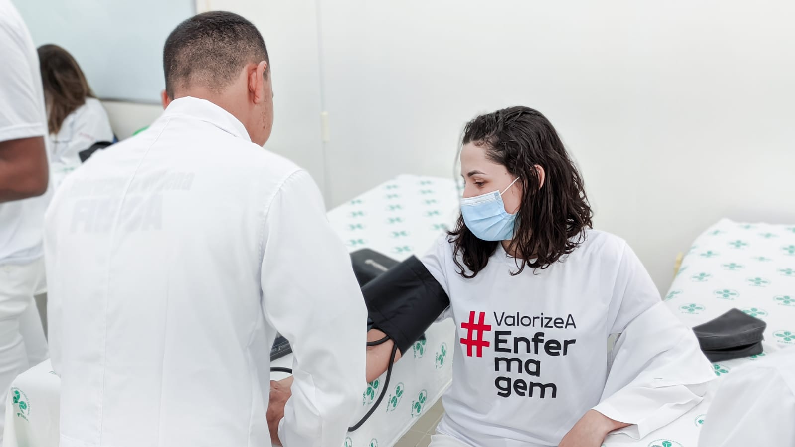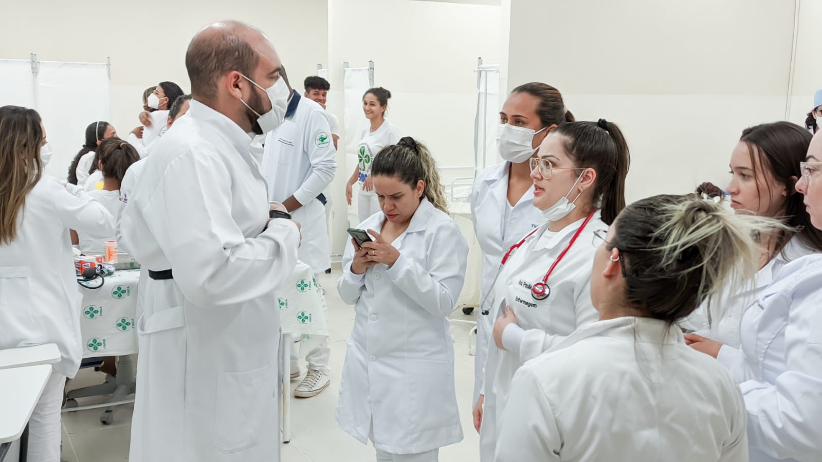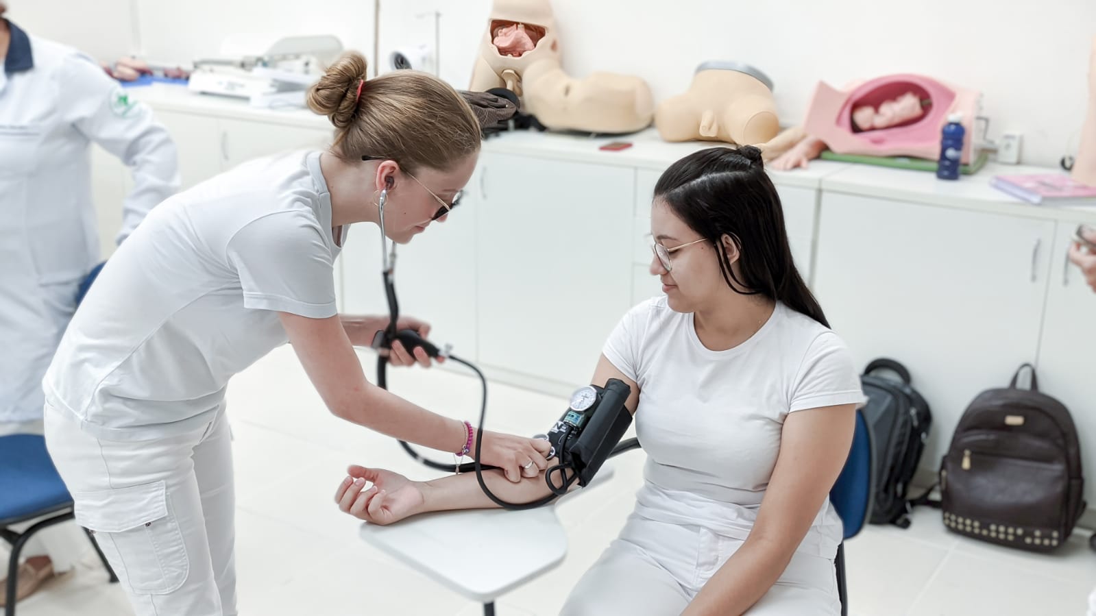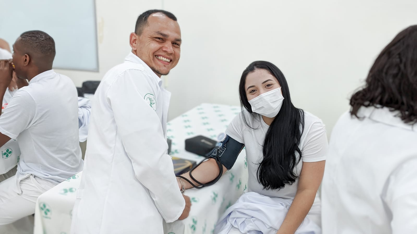 Os acadêmicos do 3º período de Enfermagem participaram da aula prática de fisiologia: Cardiorrespiratório e Saturação Sanguínea, neste experimento foi realizada a análise comportamental do organismo à resposta de atividades físicas e a compreensão da oxigenação do sangue. Para o experimento, foram realizadas algumas atividades como o aferimento da pressão arterial, frequência cardíaca, oxigenação sanguínea e atividades físicas com os alunos (pacientes) para compreender a variação de cada organismo.