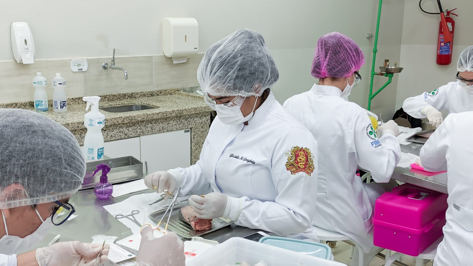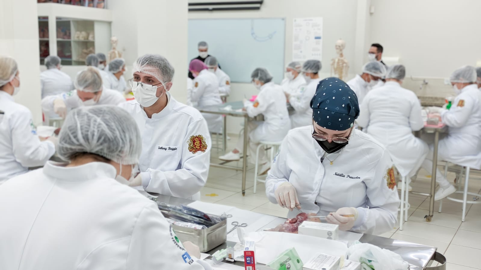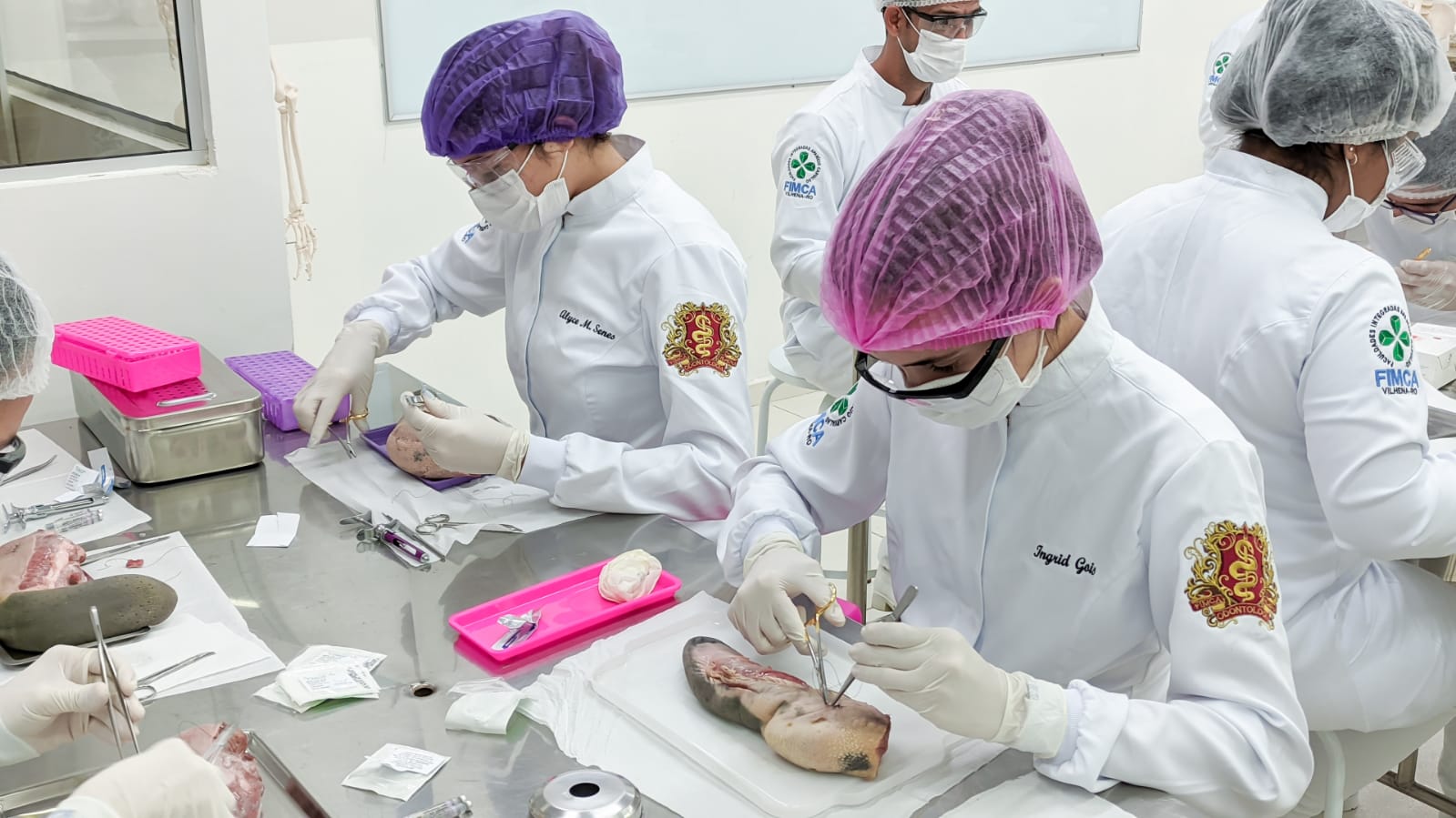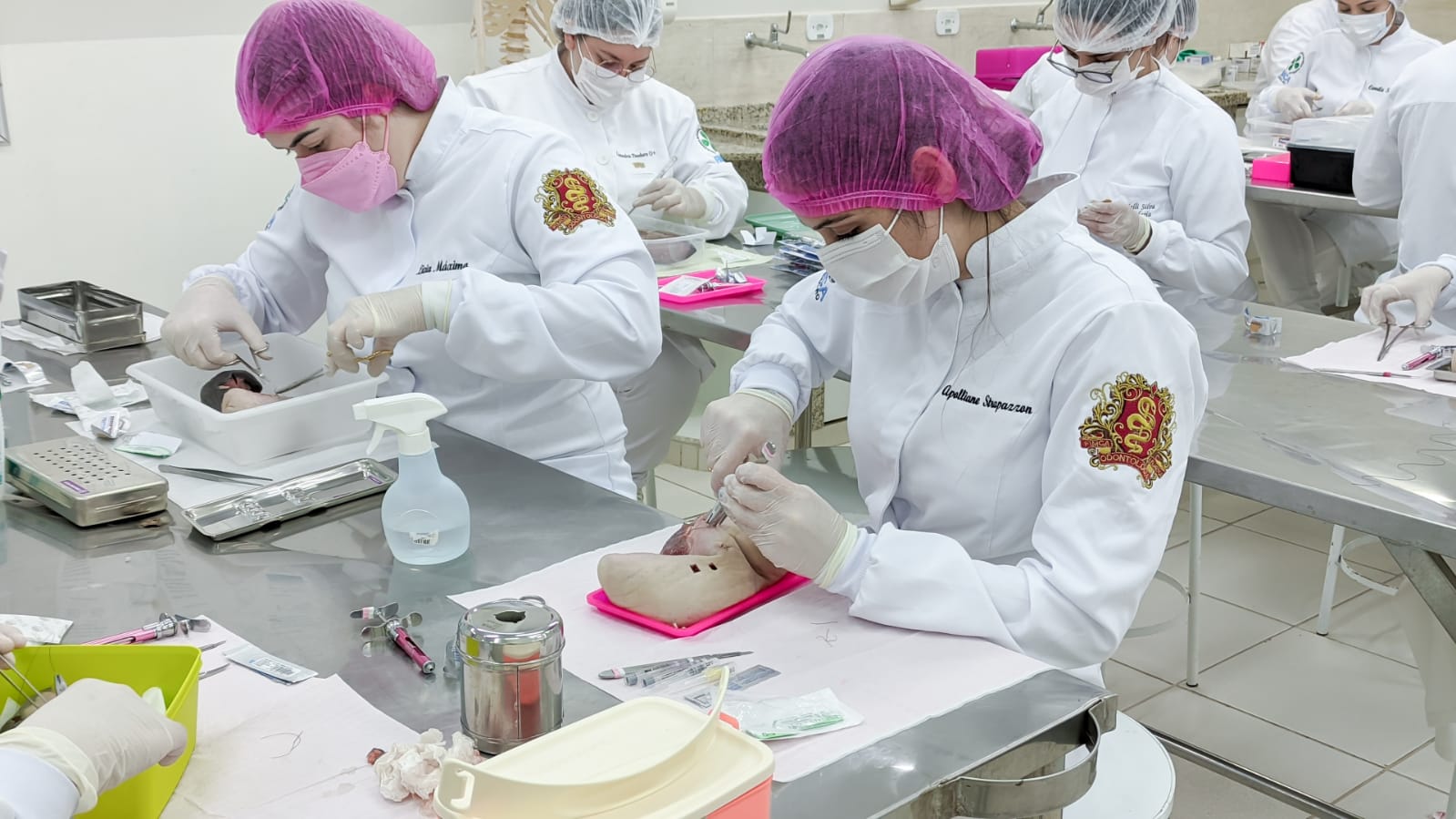 Os acadêmicos do 5º período do curso de Odontologia realizaram a prática de suturas em língua bovina. Esta peça animal é bem semelhante à textura dos tecidos moles da boca humana, como bochechas, lábios, língua e gengivas onde podem ser realizados alguns procedimentos cirúrgicos necessitando do auxílio dos pontos para cicatrização.