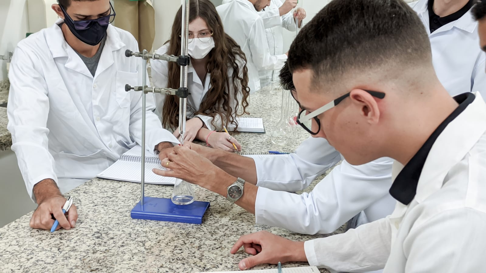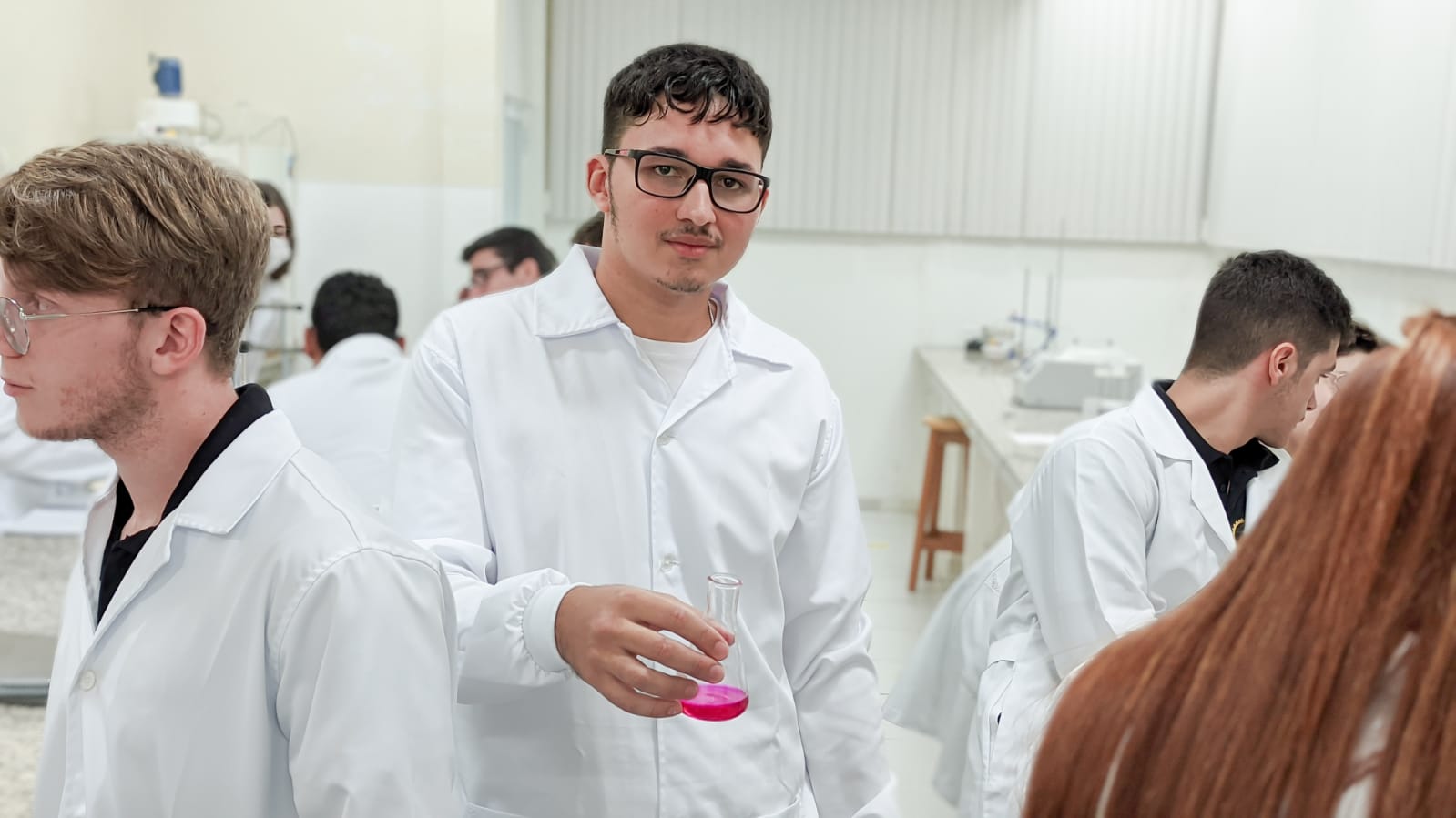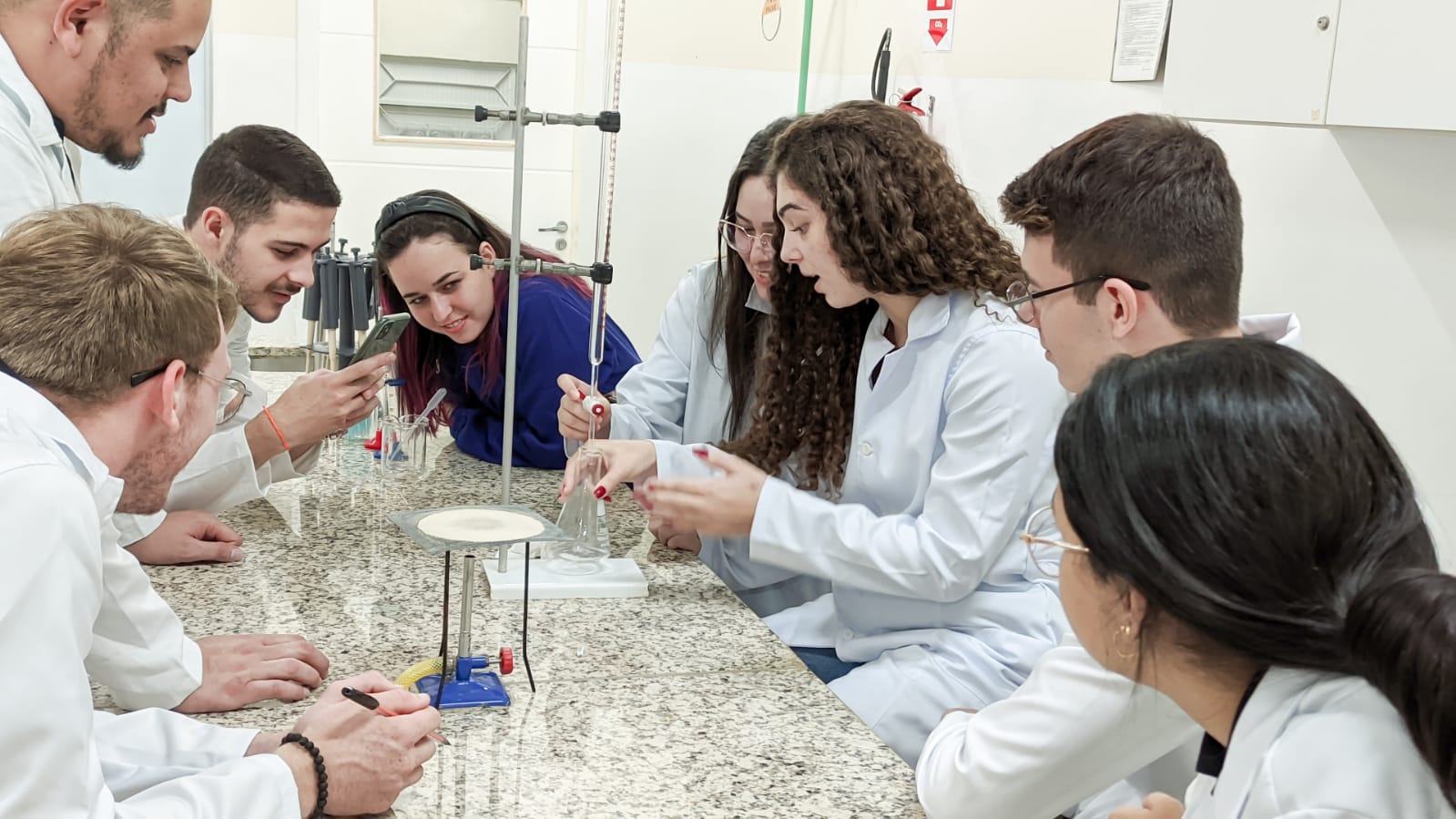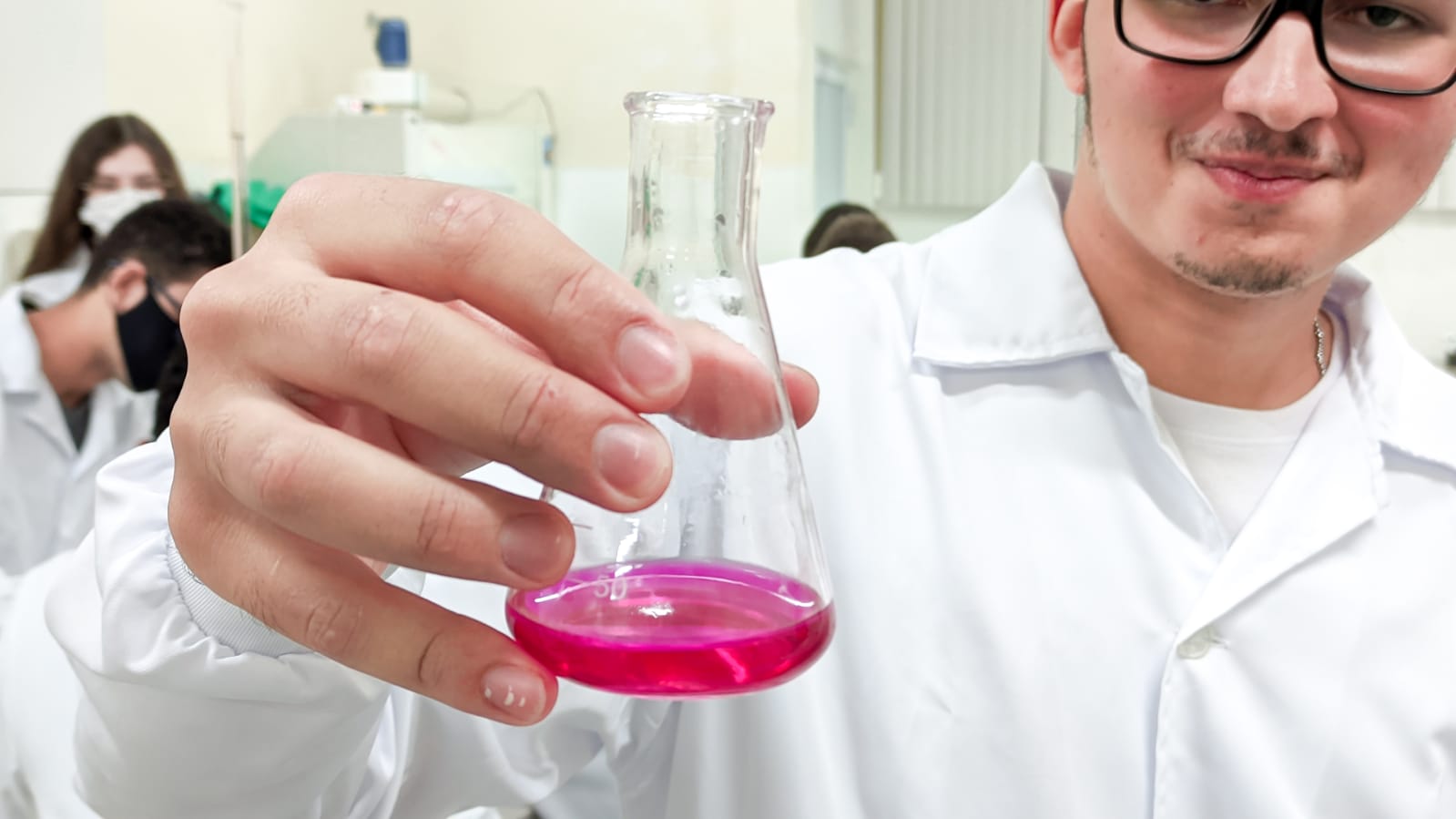 Os acadêmicos do 1º período de Engenharia Civil fizeram a titulação para a produção do sal. Neste processo foi utilizado o ácido clorídrico mais o hidróxido de sódio e o indicador para marcar a viragem do consumo de todo o ácido pela base, ou seja, quando o líquido fica todo rosa significa que todo o ácido foi consumido da solução, sendo assim, tiveram a reação completa para a formação do cloreto de sódio ou sal.