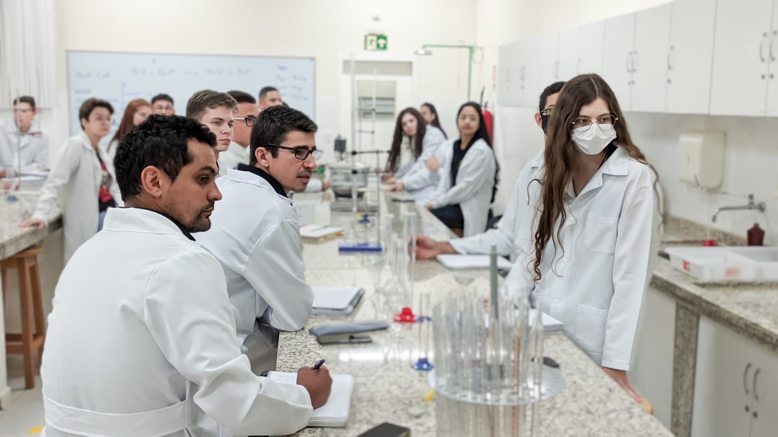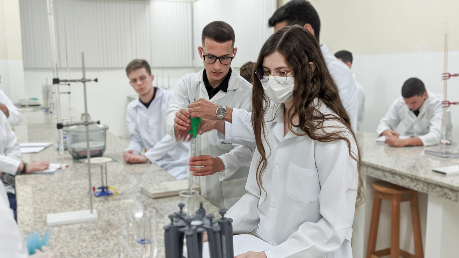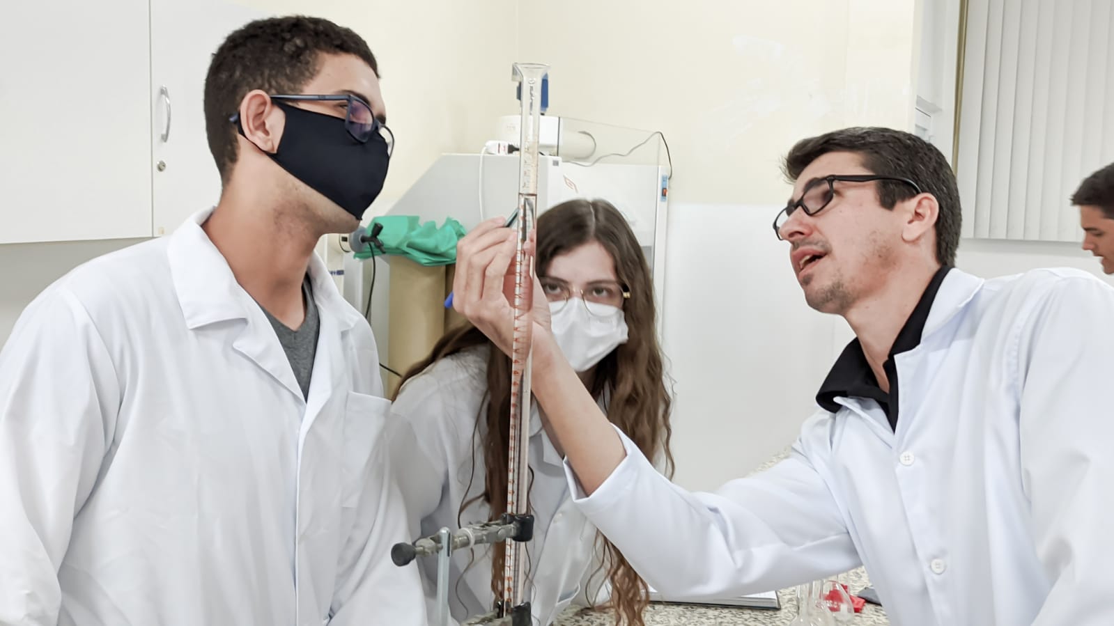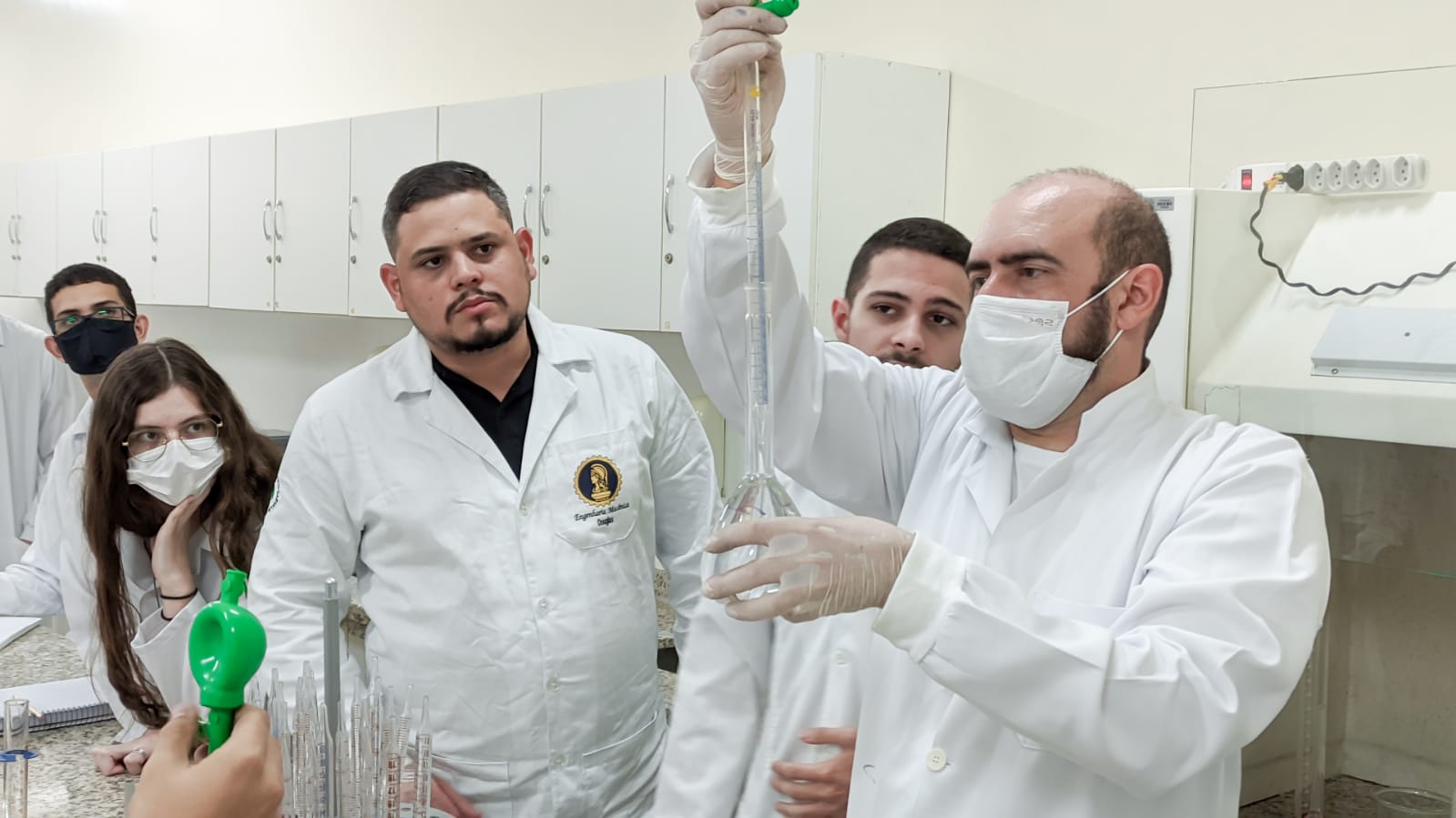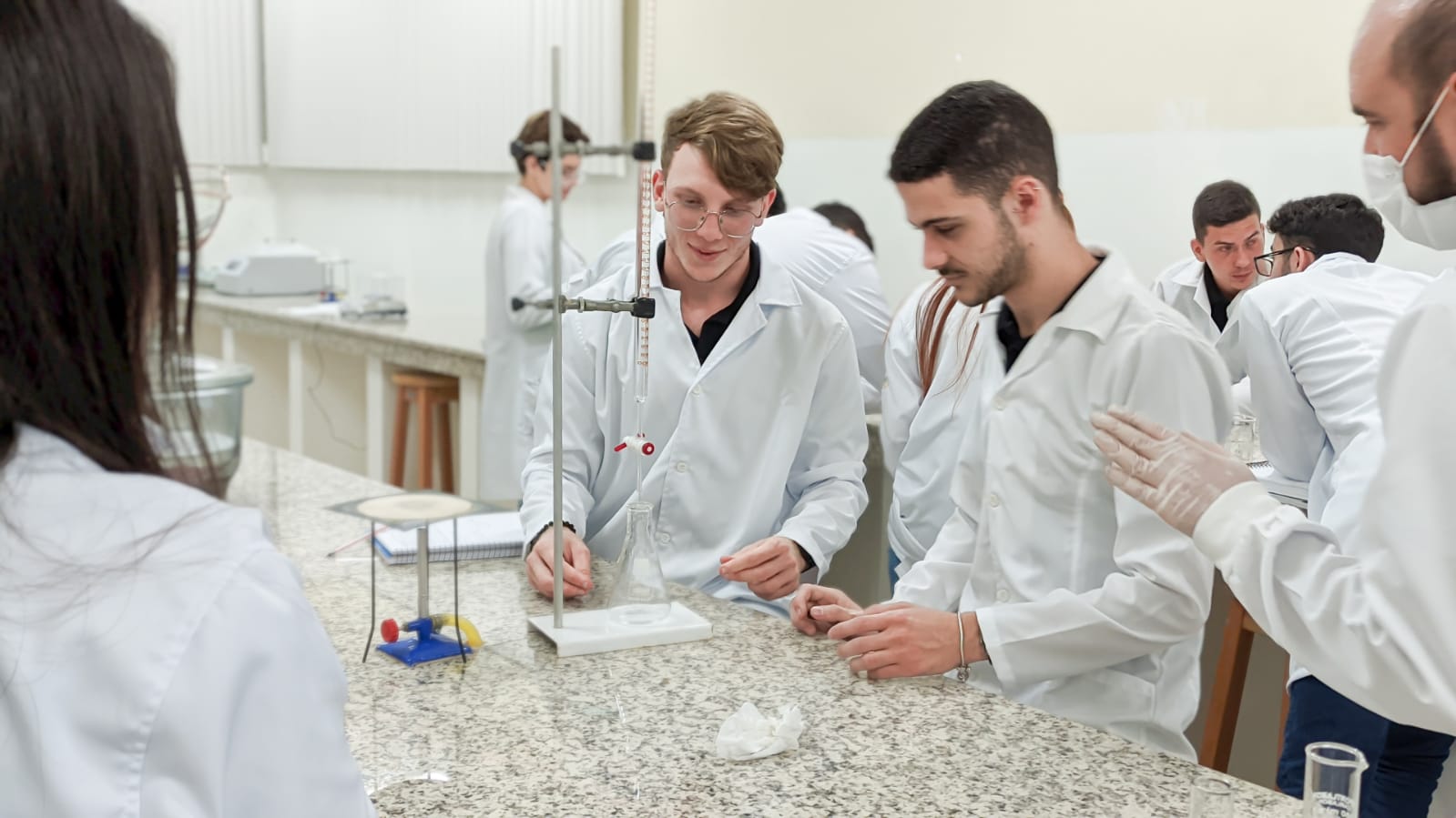 Os acadêmicos do 1º período de Engenharia Civil fizeram a titulação para a produção do sal. Neste processo foi utilizado o ácido clorídrico mais o hidróxido de sódio e o indicador para marcar a viragem do consumo de todo o ácido pela base, ou seja, quando o líquido fica todo rosa significa que todo o ácido foi consumido da solução, sendo assim, tiveram a reação completa para a formação do cloreto de sódio ou sal.