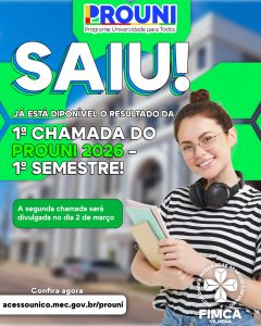 Foi publicada nesta terça-feira, 03 de fevereiro, a primeira chamada do Programa Universidade para Todos (PROUNI) 2026/1. Os candidatos pré-selecionados para as Faculdades Integradas Aparício Carvalho – FIMCA Vilhena deverão comparecer presencialmente à secretaria da instituição, no período de 03 a 13 de fevereiro de 2026, para realizar a comprovação das informações prestadas no ato da inscrição, conforme estabelece o edital do programa.