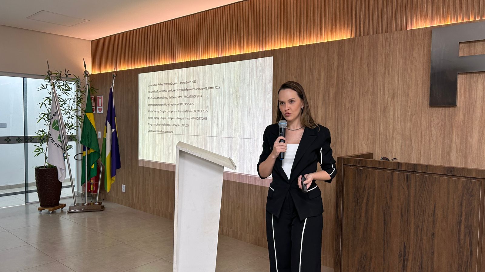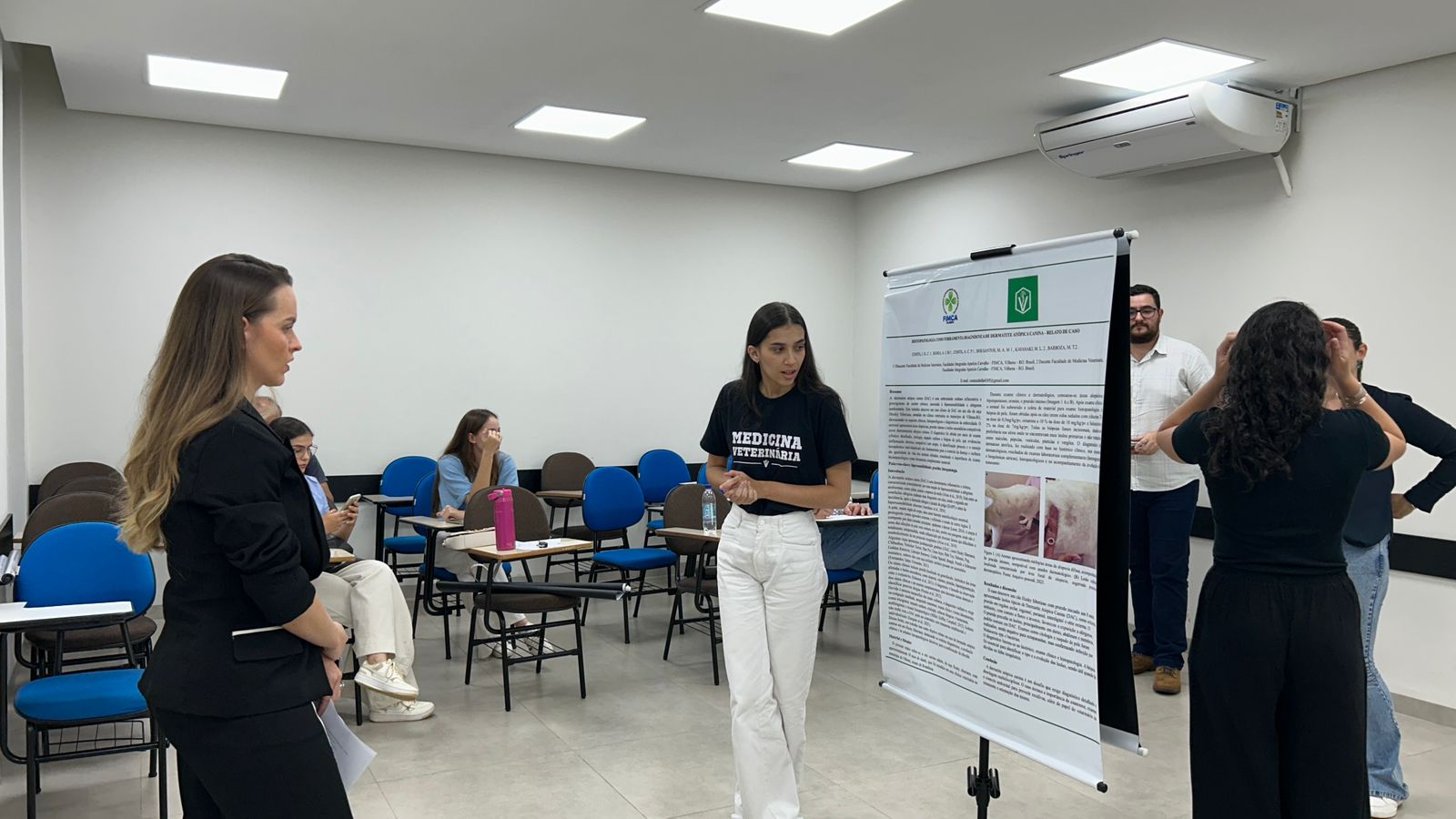 A abertura contou com palestras voltadas ao monitoramento ambiental e levantamento de fauna, ministrada pela Dra. Marcela Nechel, ampliando a compreensão dos acadêmicos sobre conservação, estudos ambientais e manejo de espécies. Em seguida, a Dra. Janaína Gindri apresentou uma abordagem aprofundada sobre microcirurgia em felinos, destacando avanços técnicos, cuidados anestésicos e protocolos cirúrgicos modernos temas essenciais para quem pretende atuar na clínica de pequenos animais.