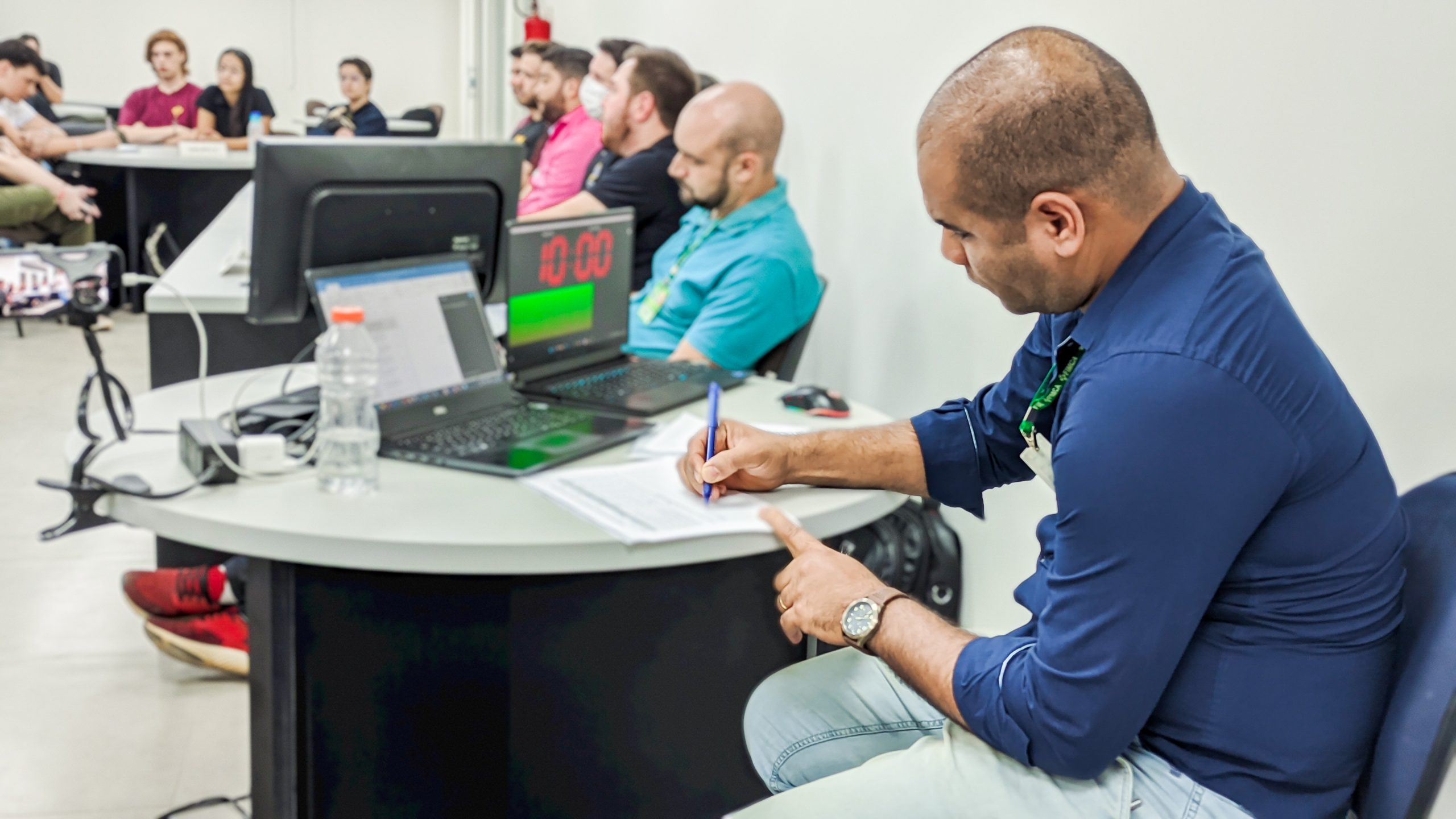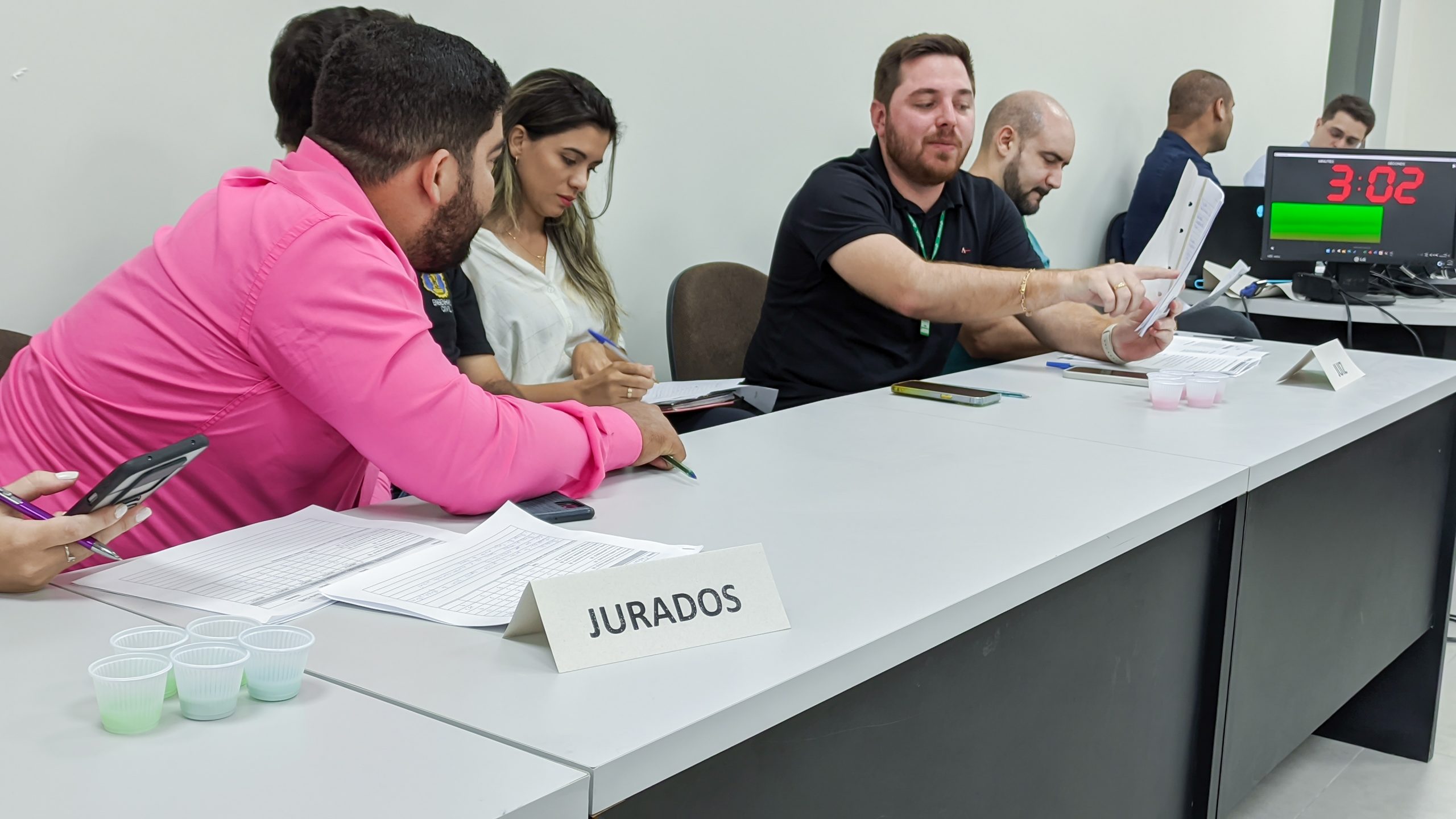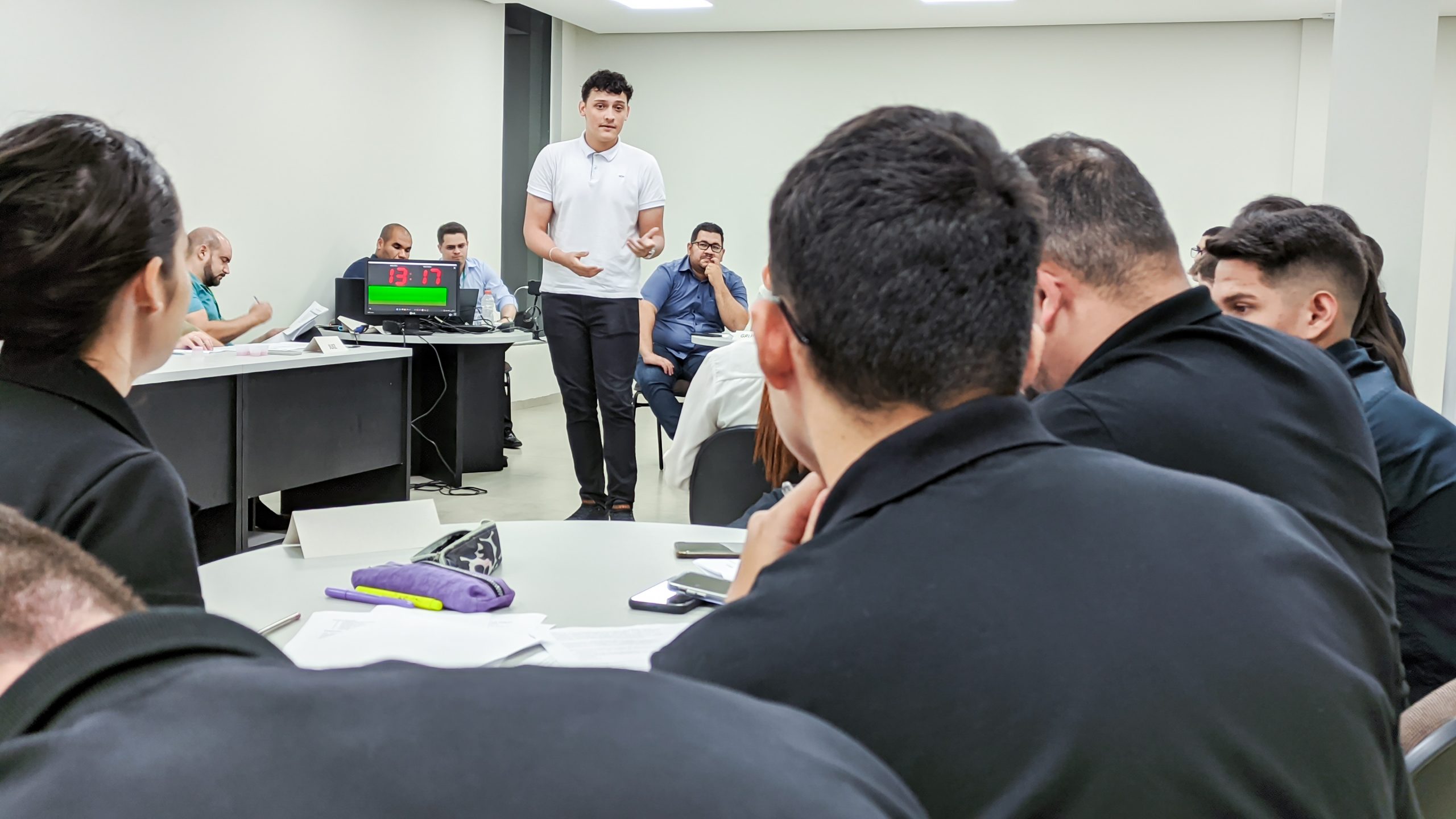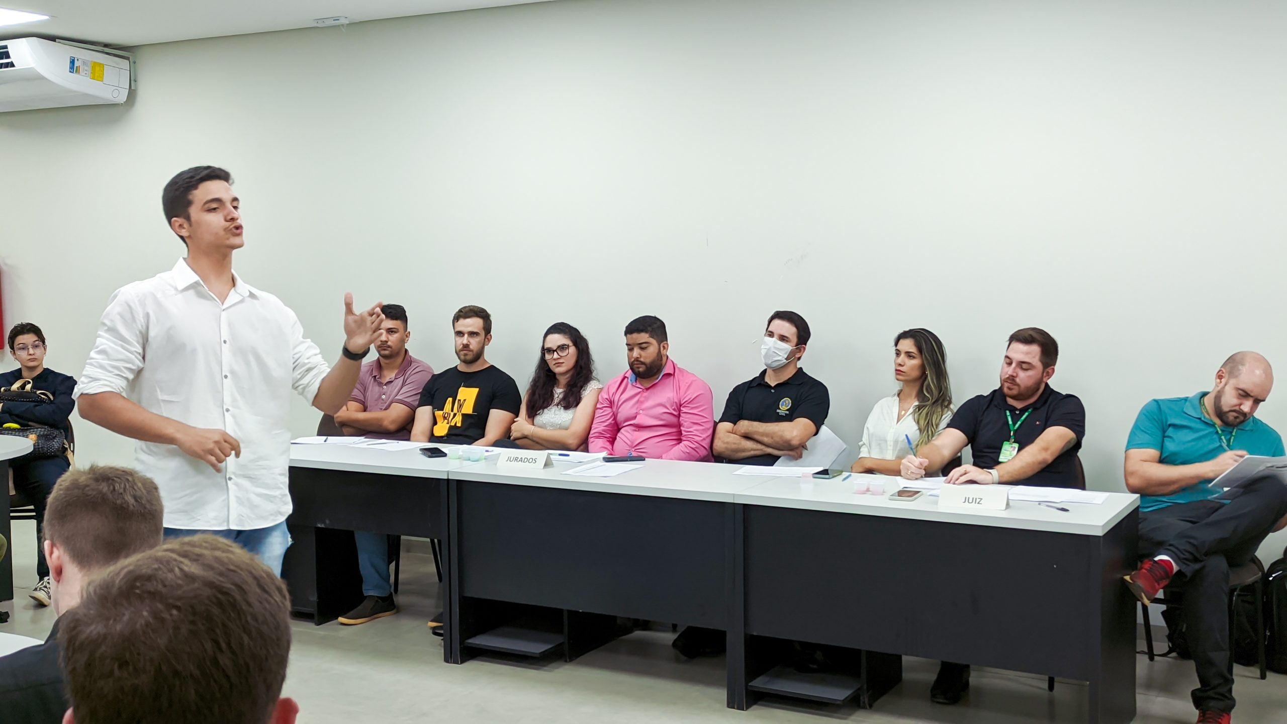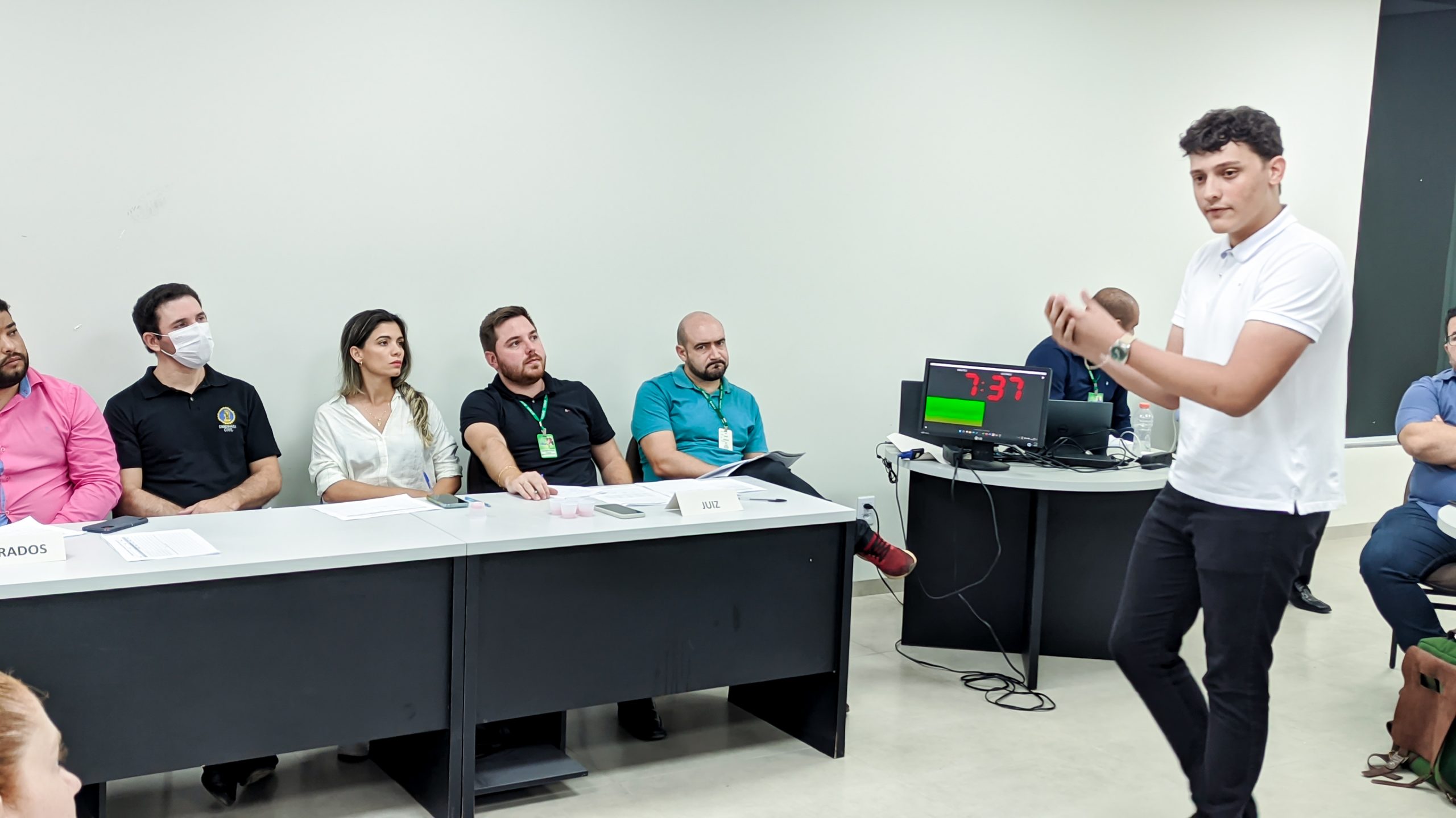 A organização se deu após um planejamento do professor que estabeleceu as regras e requisitos do júri e após a aceitação da turma participante, convidou os alunos do 10º período para compor a mesa de jurados, responsáveis pela avaliação, bem como o professor Eng Felipe Miguel para atuar como juiz, de modo a delibera aspectos não previstos no regulamento. Foi disponibilizado para cada jurado um formulário, contendo os critérios avaliativos, que consistia desde domínio e propriedade de conhecimento da temática, até gestão do tempo, criatividade, raciocínio lógico e organização da fala.
